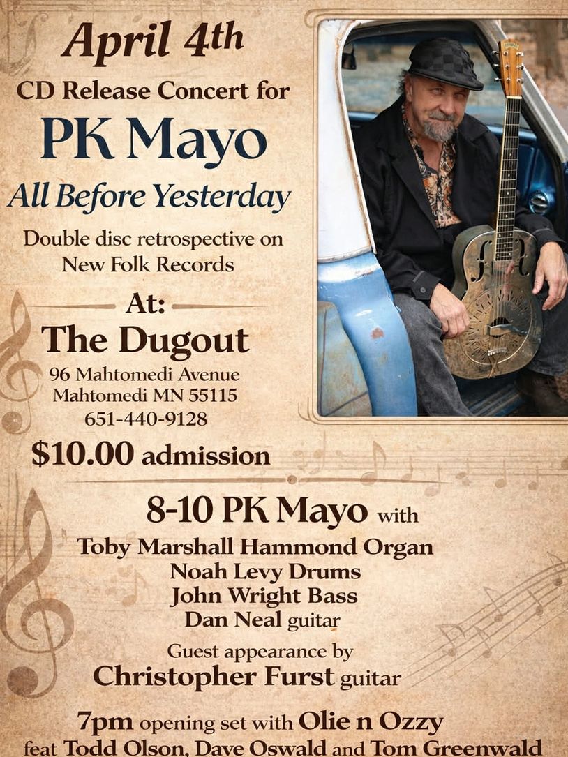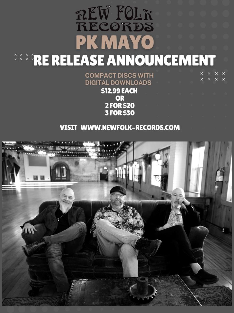A native son of northern Minnesota, PK Mayo grew up in the mining town of Eveleth. From an early age, when he was known as Paul Kennedy Mayasich, he soaked up a wide range of diverse styles of music coming over the airwaves of the local college radio station, KUMD. He refers to those listening years as his college.