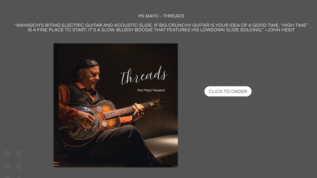 This showcases Mayo’s signature bluesy style, in an unplugged setting that highlights the depth of his songwriting and the nuances of his playing. His slide work remains impeccable, blending seamlessly with Lehto’s intricate guitar and mandolin work, while Wright’s steady, resonant bass provides the perfect foundation. The result is a rich sonic experience that pulls the list